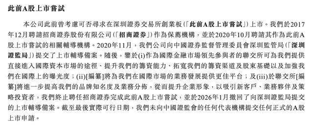 公司于2017 年12月聘请招商证券作为保荐机构,并于2020年10月聘请其作为此前A股上市尝试的相关辅导机构。2020年11月,公司向中国证券监督管理委员会深圳监管局提交了上市辅导备案。不过,2026年1月公司撤回了向深圳证监局提交的上市辅导备案。截至最后实际可行日期,其未向中国证监会的任何代表机构提交任何正式的A股上市申请。