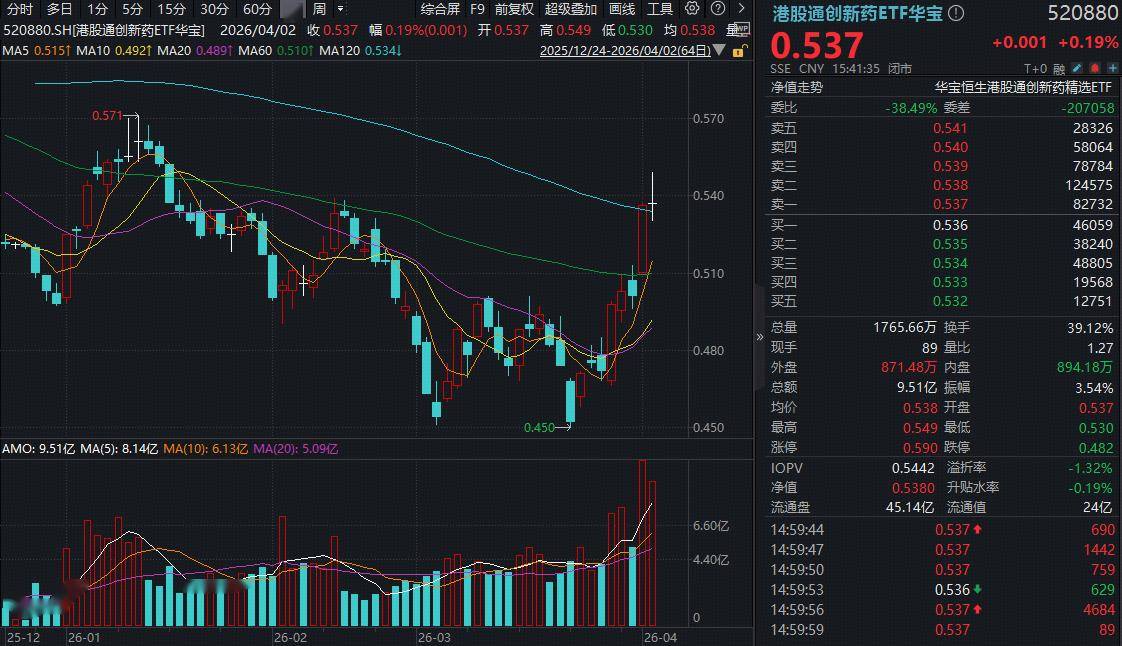 热门ETF方面,聚焦港股新能源汽车的港股通汽车ETF华宝(520780)全天逆市飘红,截至15时收盘涨0.88%。值得注意的是,因交易时间差问题,其标的指数当日收涨1.48%,预计明日开盘后该ETF或将出现补涨行情。