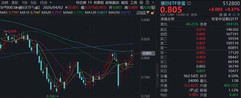 银行板块全天逆市飘红,百亿顶流银行ETF华宝(512800)场内价格一度上涨0.75%,收涨0.37%,日线拾级而上,逼近半年线。