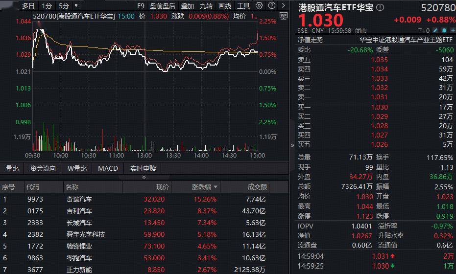 三、【尾盘狂飙!奇瑞汽车爆量涨超15%!新能源汽车迎多重利好,港股通汽车ETF华宝(520780)逆市上涨!】