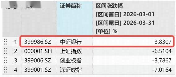 地缘冲突加大权益市场波动,并激发资金避险情绪,在这一过程中,高股息、低估值、低波动的防御板块彰显配置价值。在刚刚过去的3月,中证银行指数累计上涨3.83%,涨幅高居所有中证全指二级行业指数首位,同期上证指数、创业板指、深证成指分别下跌6.51%、3.79%、7.02%,银行板块相对沪指超额10.34%。