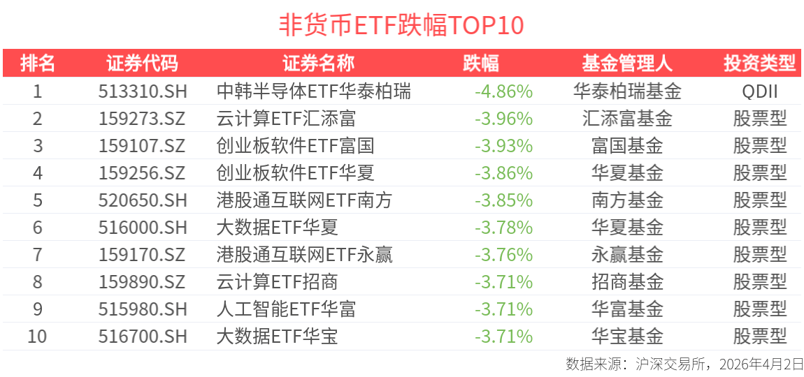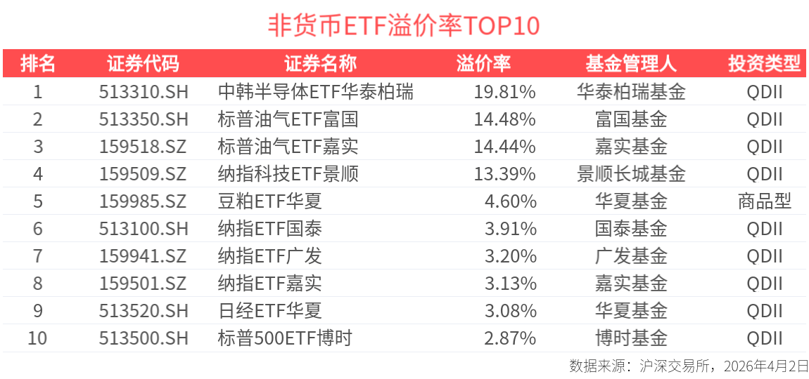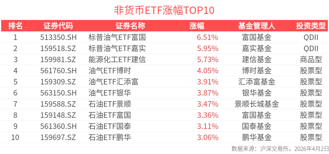 ETF英雄汇:标普油气ETF富国(513350.SH)领涨、中韩半导体ETF华泰柏瑞(513310.SH)溢价明显-20260402