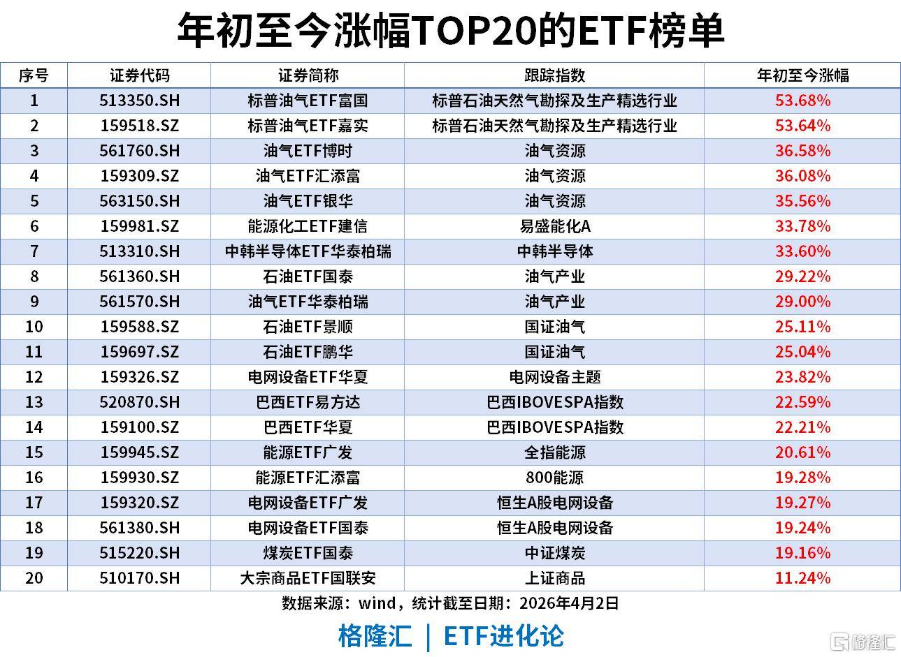 标普油气ETF富国、标普油气ETF嘉实分别以53.68%、53.64%涨幅登顶年度最强ETF,油气赛道年度涨幅突破53%,表现一骑绝尘。