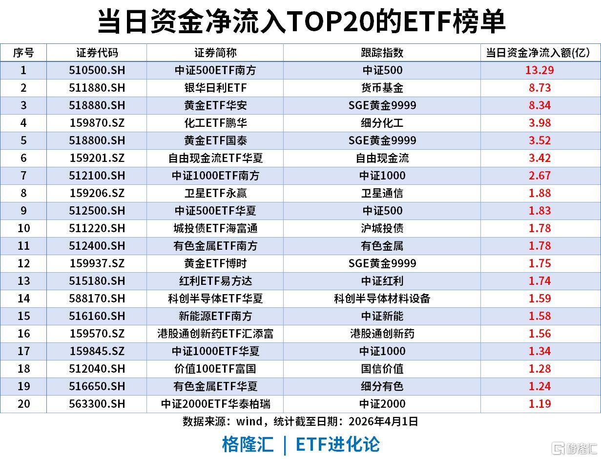黄金与避险:黄金ETF华安、黄金ETF国泰等黄金相关品种合计流入超13亿,货币基金、城投债等固收类同步获配置,避险需求温和释放。