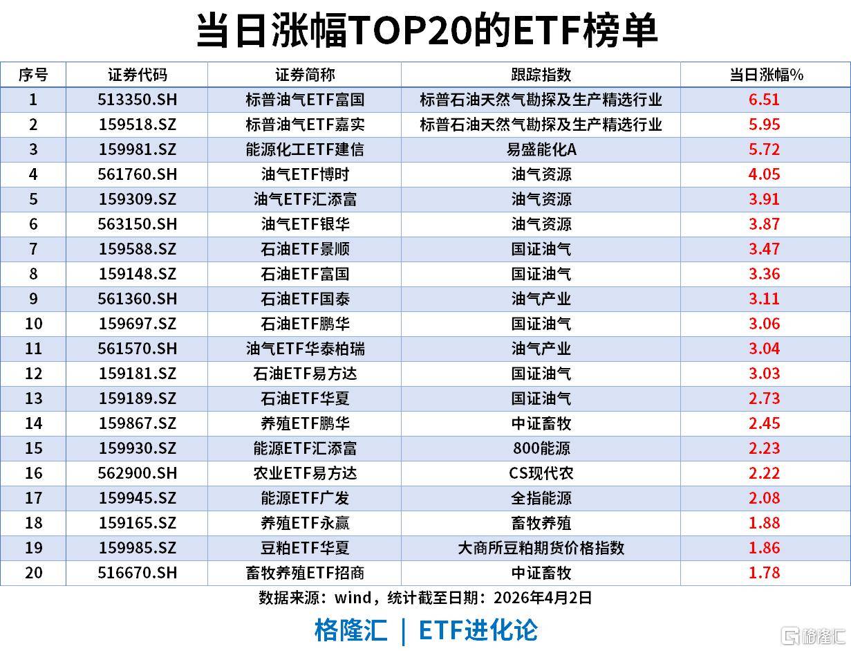 能源板块迎来全线爆发,油气相关品种包揽榜单前13席,成为当日绝对领涨主线。标普油气ETF富国以6.51%涨幅领跑,标普油气ETF嘉实、能源化工ETF建信紧随其后,涨幅均超5.7%;油气资源、国证油气、油气产业等全产业链油气ETF批量录得2.7%-4.1%涨幅,能源行情呈现极强的板块联动性。养殖、农业等农林板块同步小幅走强,涨幅在1.7%-2.5%区间,仅为能源主线的跟涨品种。