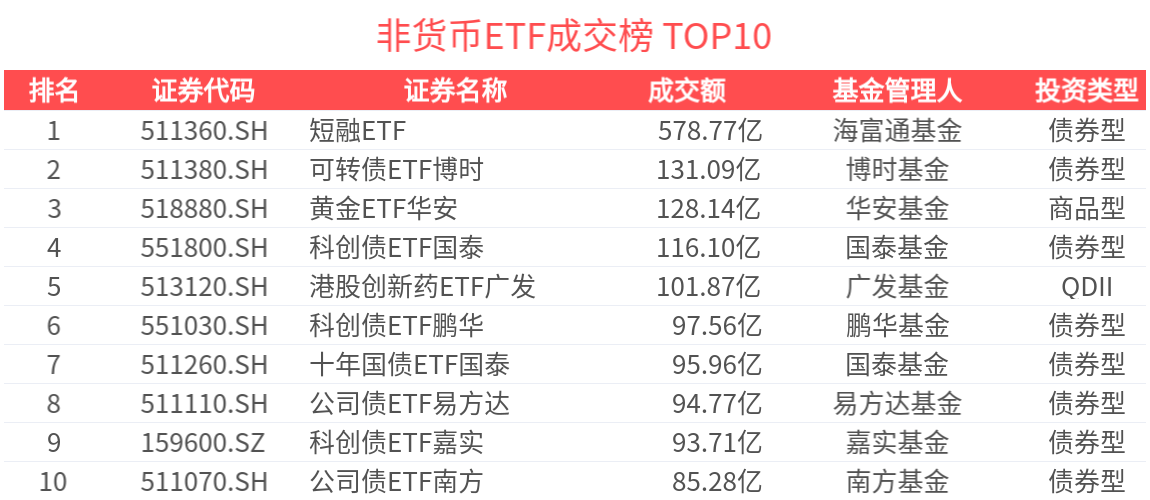 截至今日收盘,短融ETF、可转债ETF博时、黄金ETF华安成交额居市场前列,分别达578.77亿、131.09亿、128.14亿。行业主题类ETF仅1只:港股创新药ETF广发。
