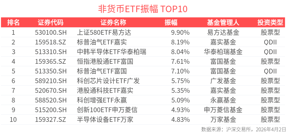2026年4月2日,非货币类ETF合计成交5233.89亿元,其中有96只ETF成交额破10亿元。