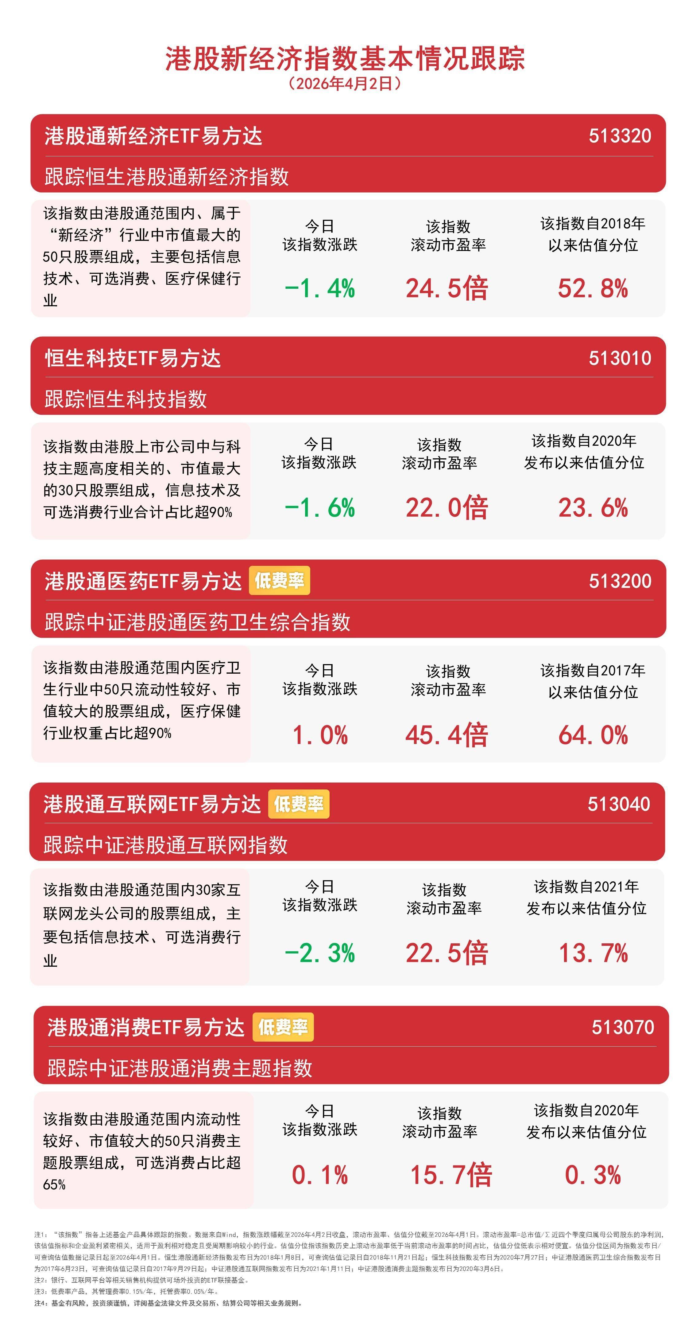 4 月 2 日,港股市场呈现明显震荡分化行情,科技成长赛道集体承压,医药、消费板块逆势走强。截至收盘,中证港股通医药卫生综合指数上涨 1.0%,中证港股通消费主题指数微涨 0.1%;恒生港股通新经济指数下跌 1.4%,恒生科技指数下跌 1.6%,中证港股通互联网指数大跌 2.3%,科技与医药消费风格显著分化。Wind 数据显示,截至昨日,恒生科技 ETF 易方达(513010,联接基金 A/C:013308/013309)近一月 “吸金” 超 24 亿元。