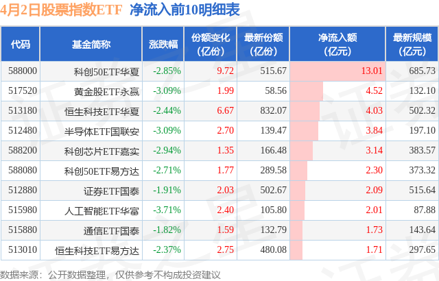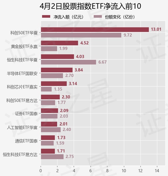 当日有225只股票指数ETF基金出现资金净流入,其中净流入排首位的是科创50ETF华夏(588000),份额增加了9.72亿份,净流入额为13.01亿元。