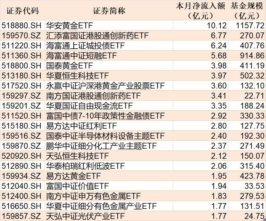 截至4月2日,本月资金净流入额居前20的ETF名单如下: