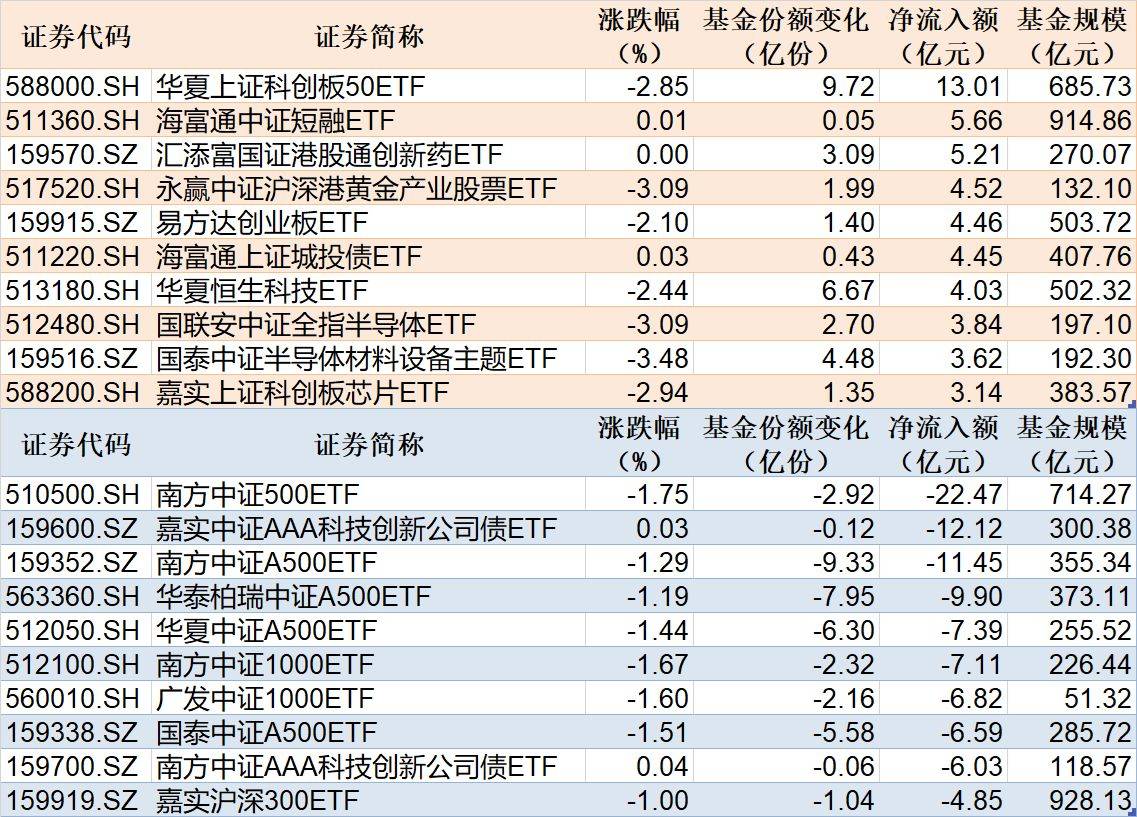 与此同时,南方中证500ETF基金份额减少2.92亿份,净流出额22.47亿元;嘉实中证AAA科技创新公司债ETF基金份额减少0.12亿份,净流出额12.12亿元;南方中证A500ETF基金份额减少9.33亿份,净流出额11.45亿元。