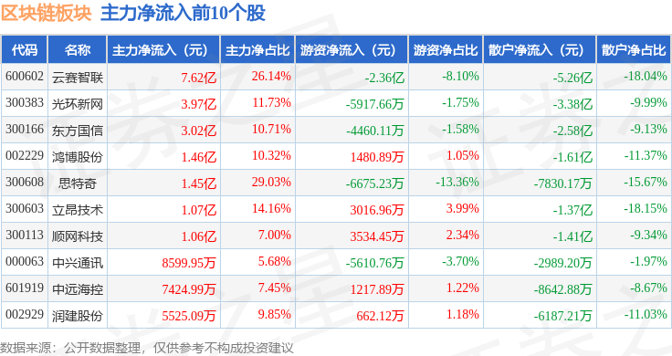 从资金流向上来看,当日区块链板块主力资金净流出19.06亿元,游资资金净流入8364.2万元,散户资金净流入18.22亿元。区块链板块个股资金流向见下表:
