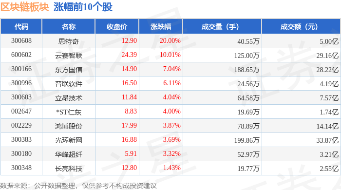 证券之星消息,4月3日区块链板块较上一交易日下跌1.23%,ST银江领跌。当日上证指数报收于3880.1,下跌1.0%。深证成指报收于13352.9,下跌0.99%。区块链板块个股涨跌见下表: