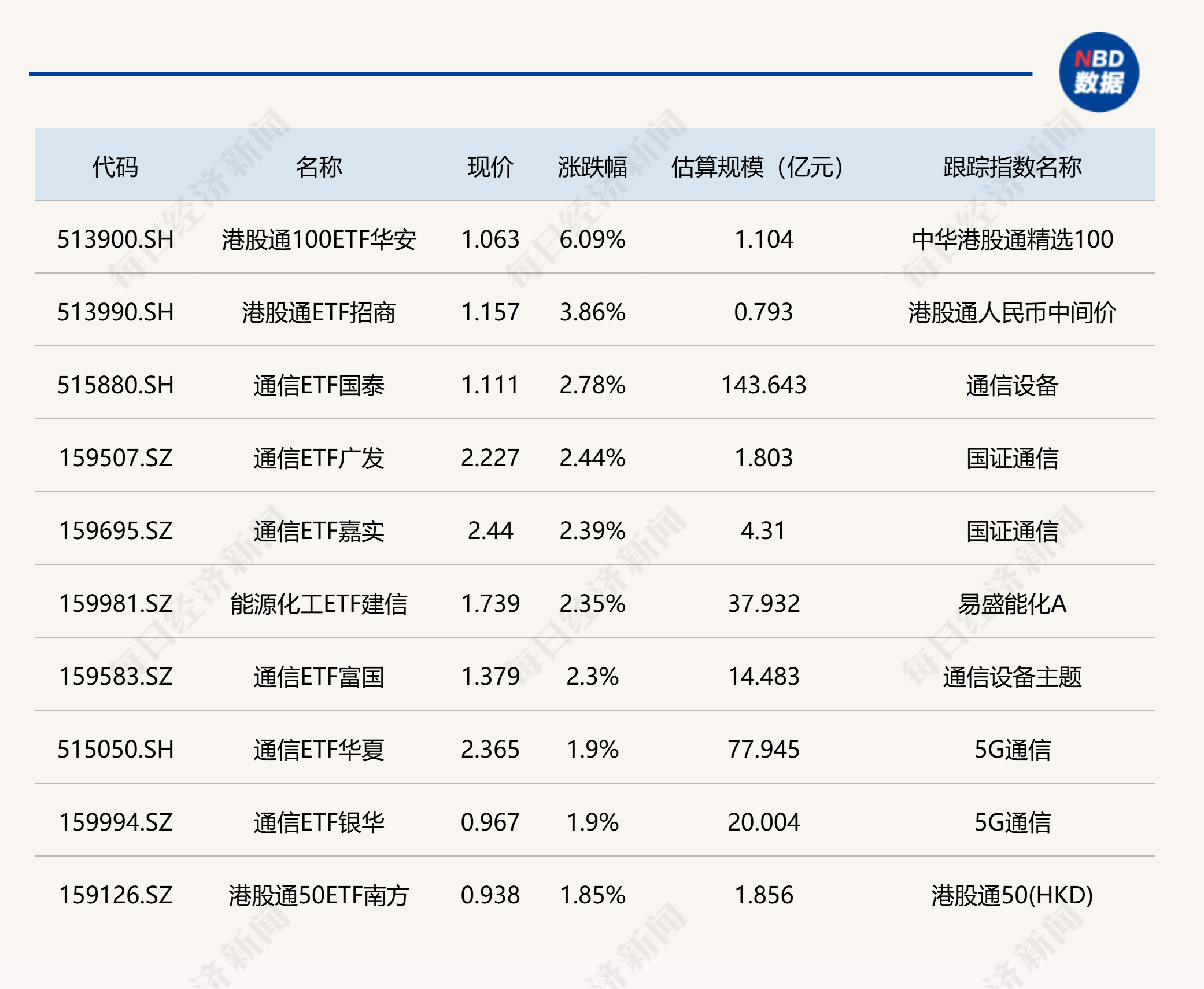 ETF涨跌幅方面,港股通100ETF华安涨超6%,通信相关ETF涨超2%。
