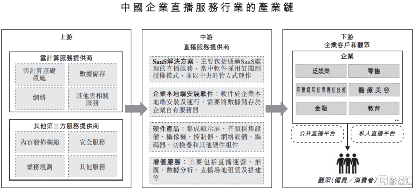中国企业直播服务产业链上游包括云技术服务提供商及其他第三方服务提供商,参与者包括阿里云、腾讯云、华为云、索尼、云犀等。