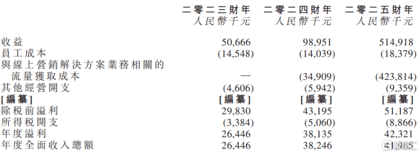 线上营销解决方案业务之所以毛利率那么低,是因为有大量资金花在流量获取上。随手播2025年的流量获取成本高达4.24亿元,占同期总收入的82.3%。