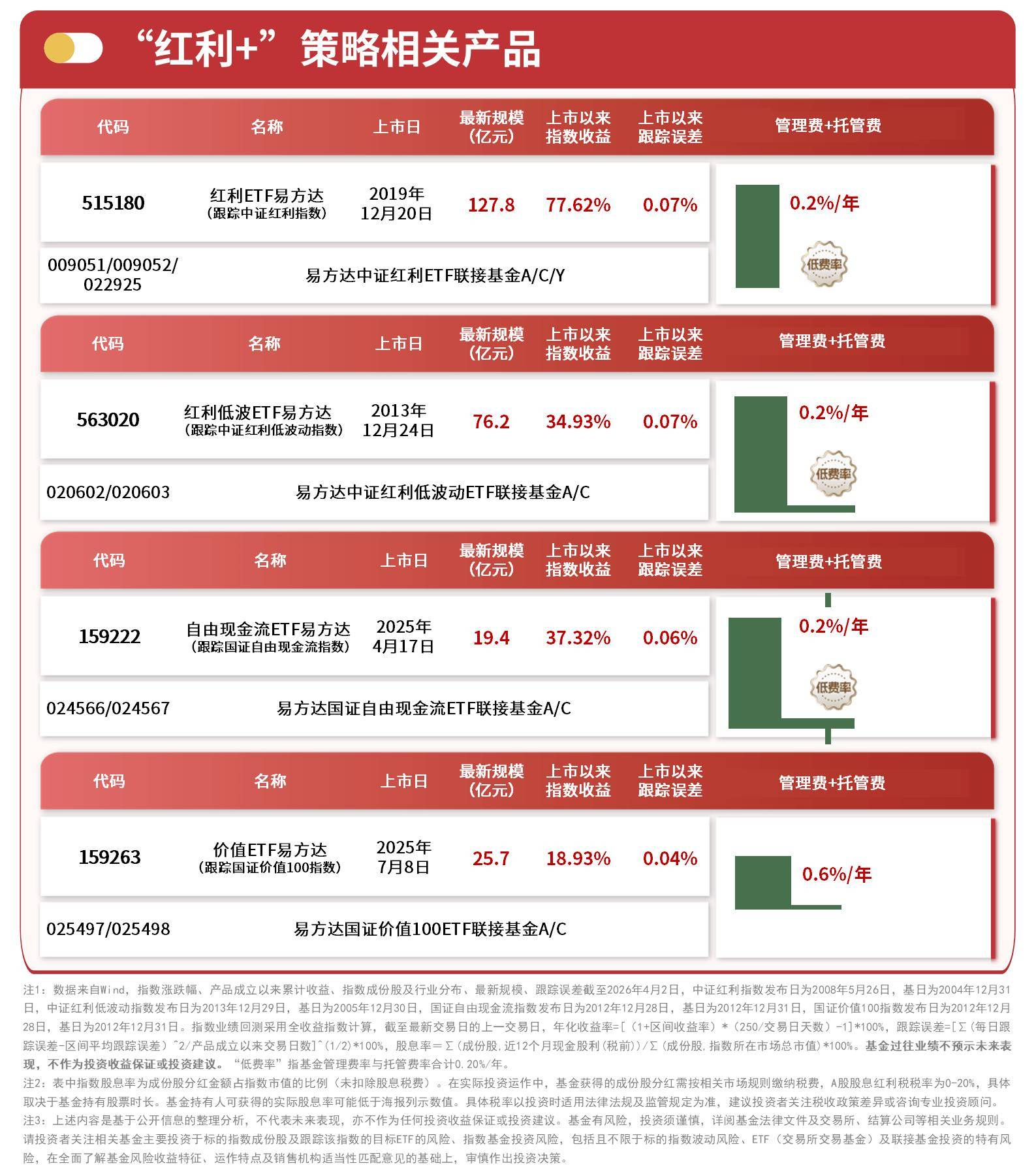易方达基金旗下 “红利 +” 系列 ETF 详见下图所示,价值 ETF 易方达(159263)跟踪国证价值 100 指数,最新规模 25.7 亿元,管理费 + 托管费 0.6%/ 年;红利 ETF 易方达(515180)、红利低波 ETF 易方达(563020)、自由现金流 ETF 易方达(159222)均实行 0.2%/ 年的低费率策略。