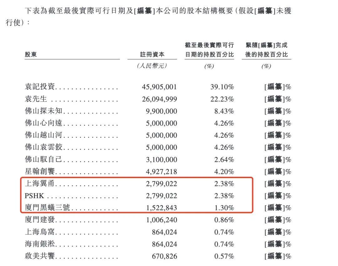 截至招股书最后实际可行日期,PSHK、上海翼甬、厦门黑蚁三号合共持有袁记食品6.06%股权。