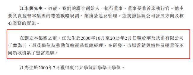 在创立集团之前,江永兴于2000年10月至2015年2月任职于华为技术有限公司(“华为”),最后职位为移动传输产品线总经理,在研发、市场营销与销售及运营等不同领域积累了丰富经验。