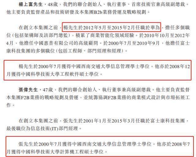 而杨上富及张伟两人本科均为西南交通大学信息管理专业,同校同专业;硕士均就读于中国科学技术大学,虽是不同专业,但两人毕业后均先后入职富士康科技集团。在杨上富从华为离职1个月之后,张伟也随之离职参与创业。