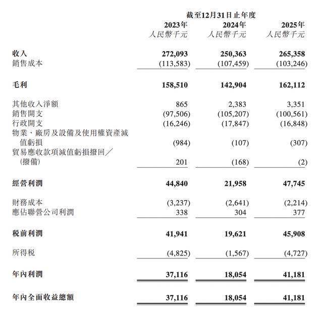 2023年-2025年,毛源昌的收入分别为2.72亿元、2.5亿元、2.65亿元,年内利润分别为3711.6万元、1805.4万元、4118.1万元,毛利率分别为58.3%、57.1%、61.1%,净利率分别为13.6%、7.2%、15.5%。