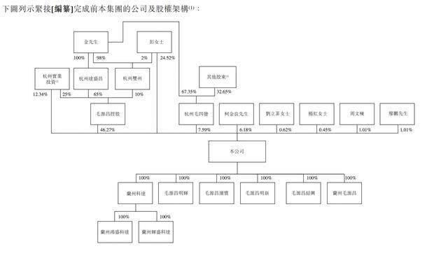 IPO前,毛源昌控股持有公司约46.27%的股权,而毛源昌控股由杭州达盛昌持股65%,杭州达盛昌为金增敏的全资拥有公司,及杭州双州持股10%,杭州双州为金增敏作为普通合伙人控制的有限合伙企业,亦由金增敏持有98%股权及彭美柳持有2%股权。