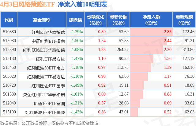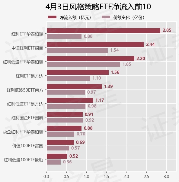 当日有17只风格策略ETF基金出现资金净流入,其中净流入排首位的是红利ETF华泰柏瑞(510880),份额增加了8850.0万份,净流入额为2.85亿元。