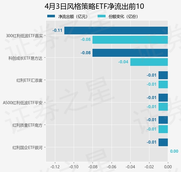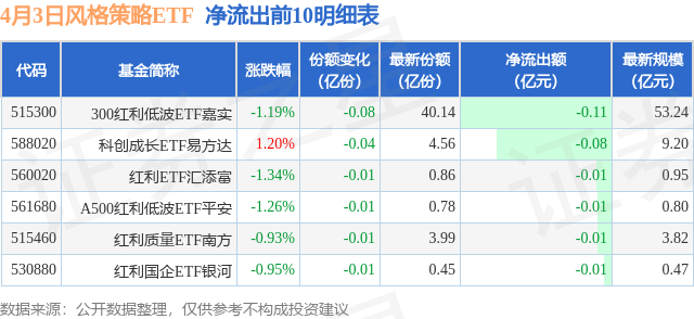 当日有6只风格策略ETF基金出现资金净流出,其中净流出排首位的是300红利低波ETF嘉实(515300),份额减少了800.0万份,净流出额为1061.93万元。