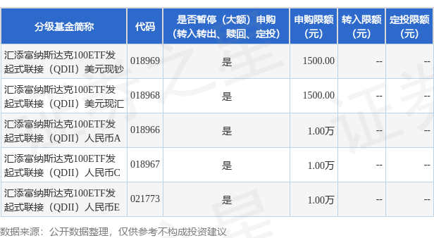 注:1、汇添富纳斯达克100ETF发起式联接(QDII)人民币A、汇添富纳斯达克100ETF发起式联接(QDII)人民币C、汇添富纳斯达克100ETF发起式联接(QDII)人民币E自2026年04月01日起限制大额申购、大额定期定额投资业务,限制金额为50000人民币元,汇添富纳斯达克100ETF发起式联接(QDII)美元现钞、汇添富纳斯达克100ETF发起式联接(QDII)美元现汇自2026年04月01日起限制大额申购、大额定期定额投资业务,限制金额为7000美元,详见本公司于2026年03月31日发布的《关于汇添富纳斯达克100交易型开放式指数证券投资基金发起式联接基金(QDII)调整大额申购、定期定额投资业务限制金额的公告》。