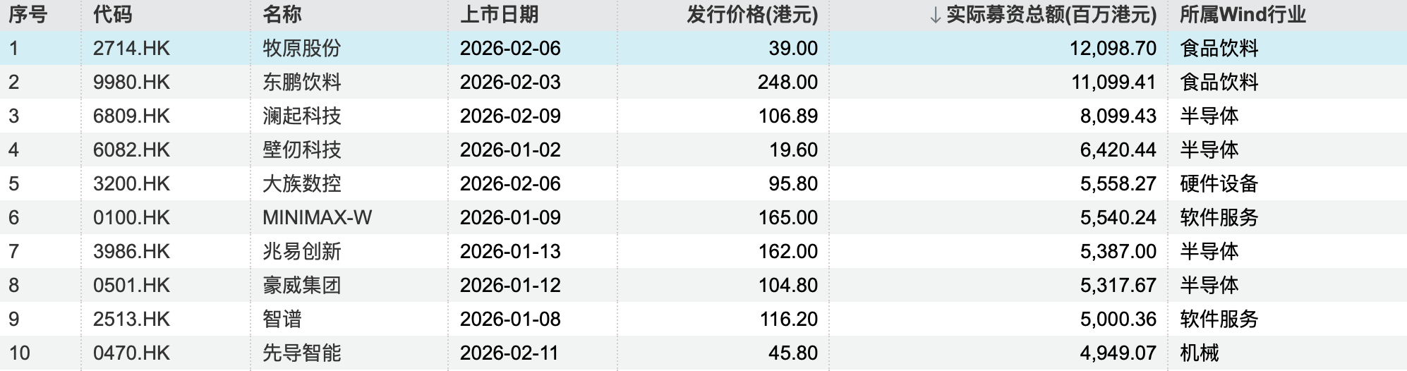 牧原股份、东鹏饮料两大消费龙头单家募资额均超百亿港元,合计贡献超230亿港元募资额,成为一季度募资规模的顶梁柱;兆易创新、澜起科技等半导体企业,华沿机器人等高端装备企业,通过“A+H”模式打通境内外资本通道。