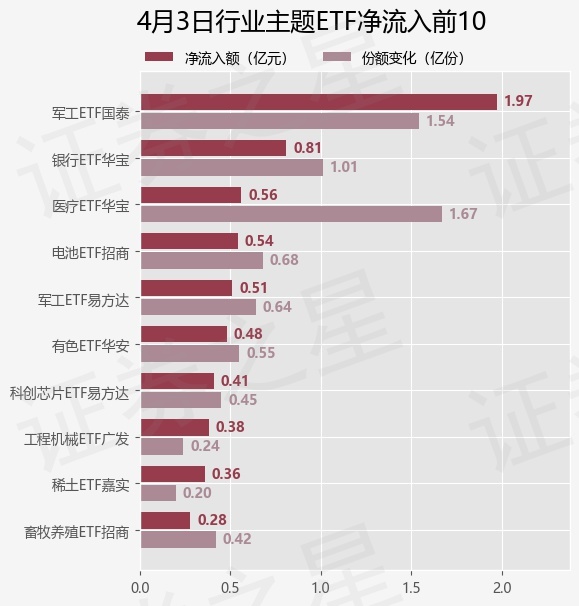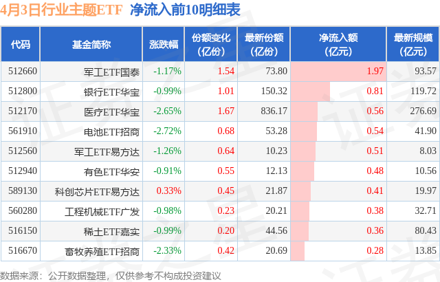 当日有91只行业主题ETF基金出现资金净流入,其中净流入排首位的是军工ETF国泰(512660),份额增加了1.54亿份,净流入额为1.97亿元。