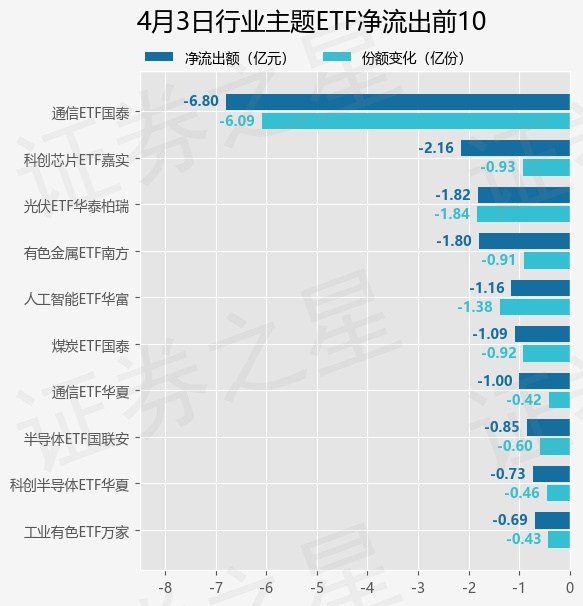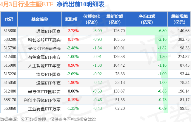 当日有120只行业主题ETF基金出现资金净流出,其中净流出排首位的是通信ETF国泰(515880),份额减少了6.09亿份,净流出额为6.8亿元。