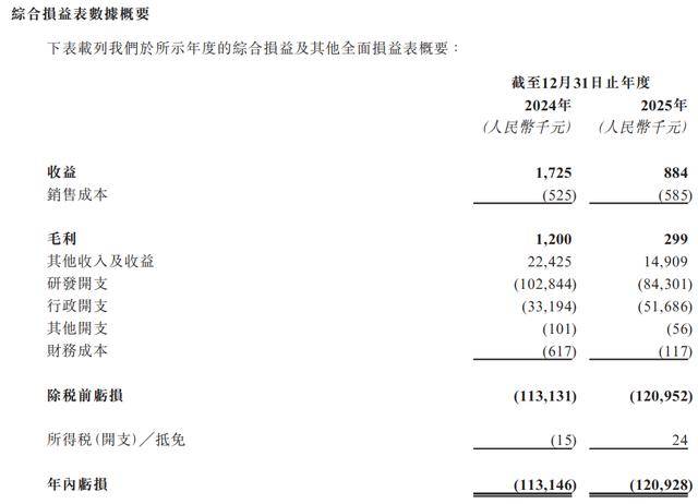 最新财务数据方面,招股书显示,2024年公司收益为172.5万元,2025年收入88.4万元,同比下滑48.75%;2024年公司毛利为120万元,2025年毛利为29.9万元,同比大幅下滑75.1%;公司2024年亏损1.13亿元,2025年亏损1.21亿元,亏损有所扩大。