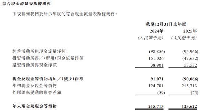 于2024年及2025年,公司分别录得经营活动所用现金净额人民币-9890万元及人民币-9600万元。负经营现金流量可能需要公司取得额外融资来满足公司的资金需求及义务以及支持公司的扩张计划。倘公司寻求其他融资活动,公司将产生额外融资成本,公司亦不能保证将能够按照公司可接受的条款取得融资,甚至根本无法取得融资,而这可能对公司的流动资金及财务状况造成重大不利影响,及公司可能无法按预期扩张业务。倘若公司于未来遭遇长期及持续的经营现金流出净额,公司未必会有充足的营运资金支付经营成本,公司的业务、财务状况及经营业绩可能会受到重大不利影响。