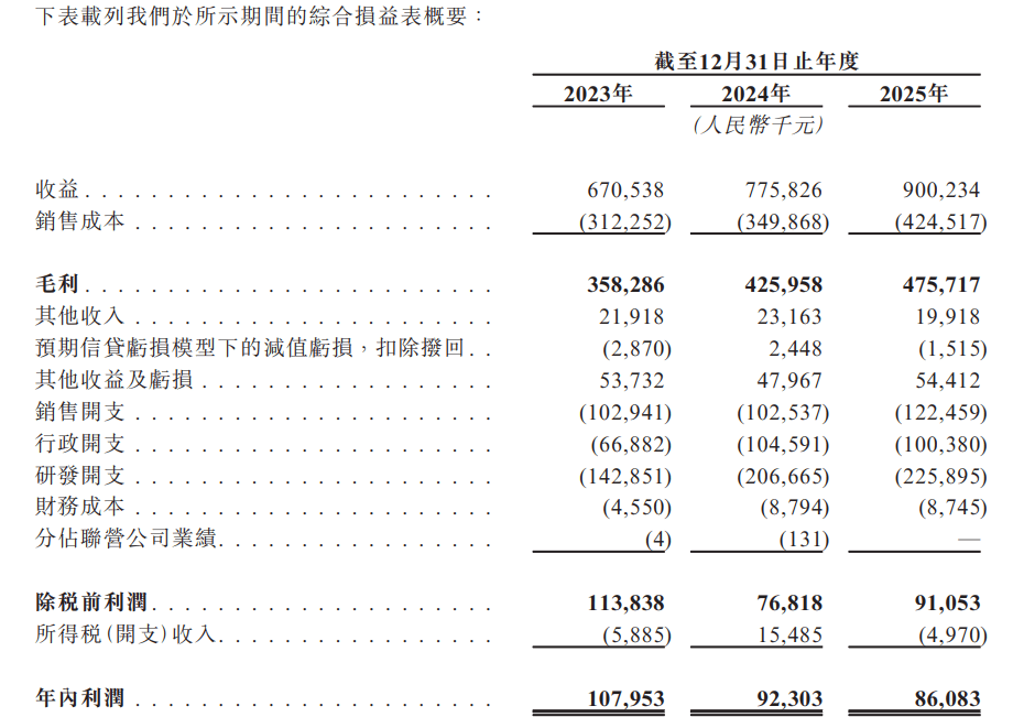 招股书显示,公司的收益由2023年的人民币6.71亿元增至2024年的人民币7.76亿元、再增至2025年的人民币9亿元,主要乃由于销量稳健增长、核心产品线成功推出新产品及解决方案业务的扩展。于2023年、2024年及2025年,公司分别录得纯利人民币1.08亿元、人民币0.923亿元及人民币0.861亿元,连续两年下降,主要原因是公司扩大了业务及运营,并在快速增长的市场上持续投资研发活动,导致销售费用及研发费用增加。