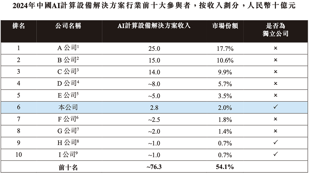 根据弗若斯特沙利文的资料,按2024年收入计,安擎为中国第六大AI计算设备解决方案提供商,市占率为2.0%,也是中国AI计算设备解决方案行业中最大的独立公司。