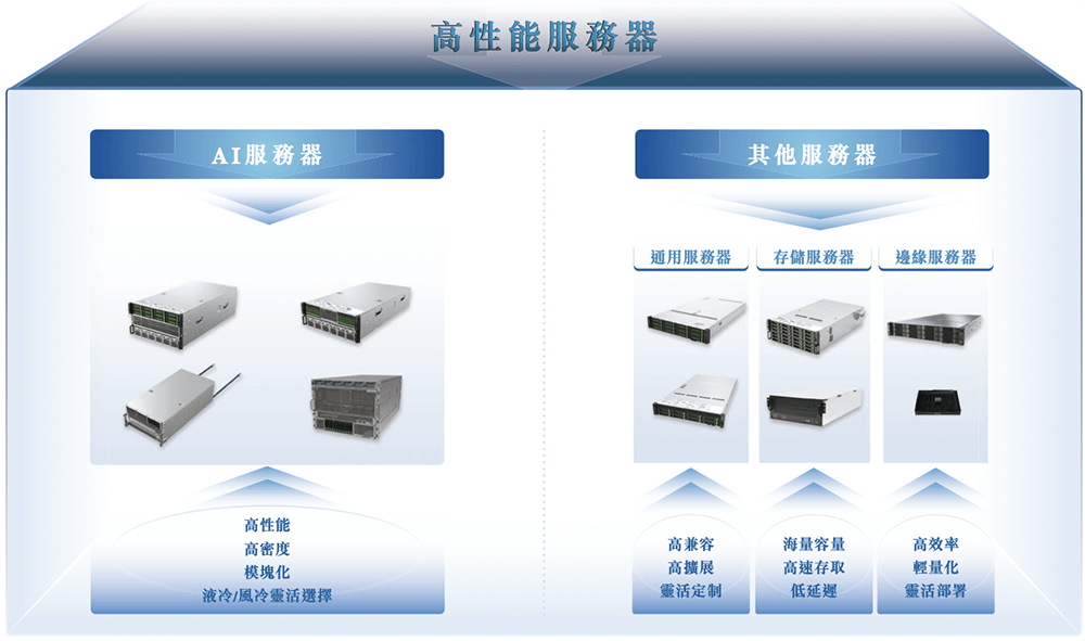 安擎的主要产品包括高性能AI服务器、其他服务器(包括通用服务器、存储服务器、边缘服务器)、支持设备及组件(主要包括AI高带宽交换机、适配卡、加速卡及CPU)等。