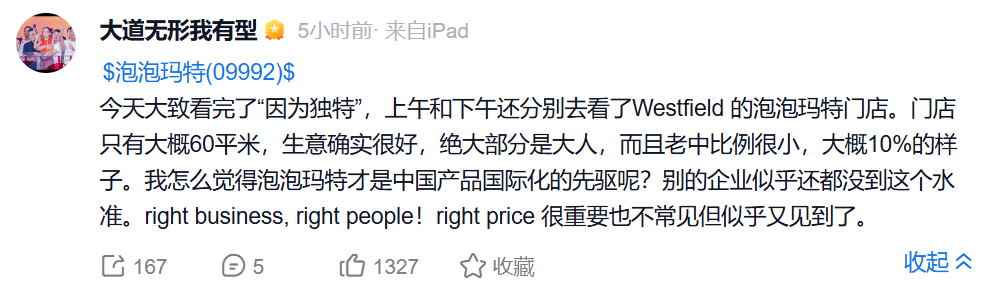 毫无疑问,泡泡玛特的模式拥有极高的上限。4月4日,投资人段永平分享了自己走访海外泡泡玛特门店的见闻:60平米的店生意火爆,且九成以上是非华人的成年人。他认为泡泡玛特是“中国产品国际化的先驱”,并给出了“right business, right people”的评价。