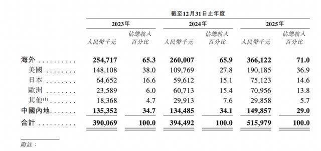 XREAL采用多元化的全渠道销售模式,结合直接销售及向分销商销售,并已建立遍及全球主要市场的销售网络。于往绩记录期间,直接销售收入占公司总收入的比例分别于2023年、2024年及2025年为81.1%、72.5%及70.8%,而经分销商渠道产生的收入则由2023年占总收入的18.9%增加至2025年的29.2%。按地域划分,海外市场于2025年贡献了公司总收入的70%以上。截至2025年12月31日,公司共有6名国内分销商,以及12名海外分销商,公司的产品已销售至40个国家及地区。