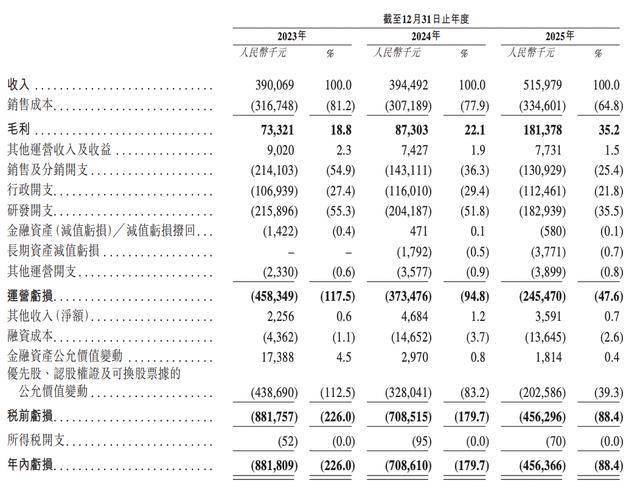 2023年至2025年,XREAL收入分别为3.90亿元、3.94亿元、5.16亿元,年内亏损分别为8.82亿元、7.09亿元、4.56亿元,毛利率分别为18.8%、22.1%、35.2%,经营费用比率分别为137.6%、117.5%、82.7%。