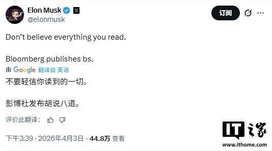 IT之家 4 月 5 日消息,埃隆 · 马斯克常在其社交平台 X 上迅速驳斥任何涉及他本人或旗下公司的虚假信息。彭博社近期发布报道称 SpaceX 计划在未来几周启动首次公开募股(IPO),估值高达 2 万亿美元(IT之家注:现汇率约合 13.79 万亿元人民币),该消息被马斯克斥为“胡说八道”。