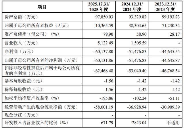 2023年至2025年,泰诺麦博营业收入分别为0元、1505.59万元、5122.49万元,净亏损分别为4.46亿元、5.15亿元、6.01亿元。