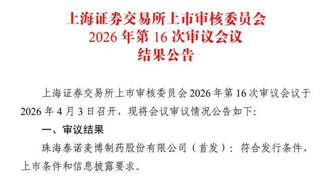 瑞财经 王敏 4月3日,上交所上市审核委员会2026年第16次审议会议结果公告显示,珠海泰诺麦博制药股份有限公司(以下简称“泰诺麦博”)首发符合发行条件、上市条件和信息披露要求。