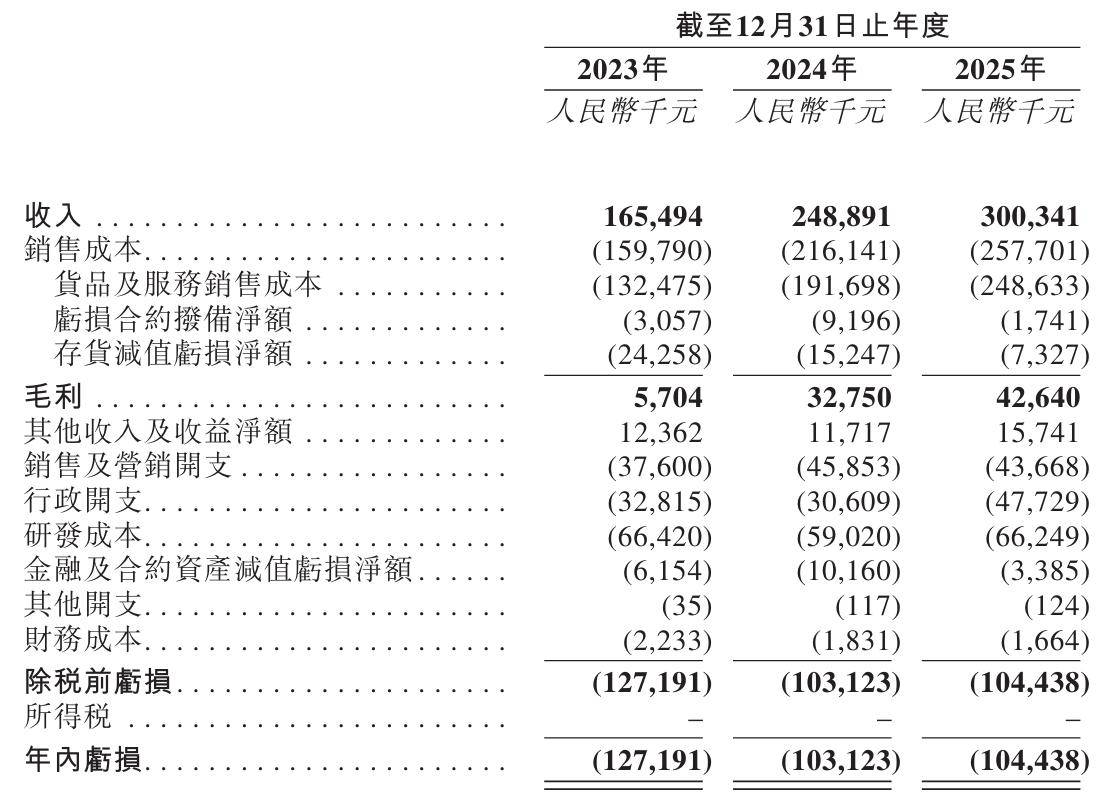 招股书显示,哥瑞利2023年、2024年、2025年营收分别为1.65亿、2.49亿元、3亿元;毛利分别为570万、3275万元、4264万元;期内亏损分别为1.27亿、1.03亿元、1.04亿元。