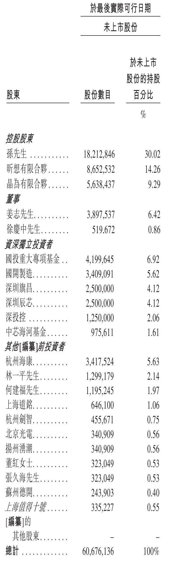 IPO前,孙志岩合共控制约53.57%投票权,包括其直接拥有30.02%股权;孙志岩作为唯一普通合伙人控制的昕想有限合伙实益拥有的约14.26%;及孙志岩作为唯一普通合伙人控制的晶为有限合伙实益拥有的约9.29%。
