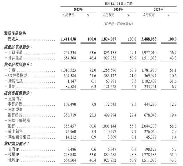 这种现场观感与招股书数据形成了相互印证。根据招股书,截至2026年3月,TOP TOY拥有24个自有IP、42个授权IP,并合作超过660个他牌IP。但从收入结构看,自有IP的贡献仍然有限。招股书显示,其自有IP收入占比仅为5.7%,授权IP和他牌IP收入合计占比高达94.3%。这意味着,每100元营收中,只有不到6元来自TOP TOY自己的IP。
