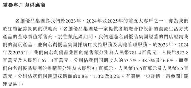此外,TOP TOY的收入至今仍与母公司名创优品深度绑定。2023年至2025年,公司来自名创优品集团的收入分别为7.81亿元、9.23亿元、16.71亿元,占总营收的比例分别为53.5%、48.3%、46.6%。换言之,TOP TOY近一半的收入来自给名创优品全球门店供货,其增长高度依赖母公司的渠道网络。