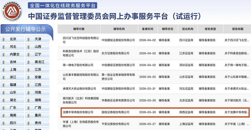 芯东西4月7日报道,3月30日,证监会官网披露,陕西西安功率半导体器件及系统解决方案提供商龙腾半导体在陕西证监局办理上市辅导备案登记,启动A股IPO进程,辅导机构是国信证券。