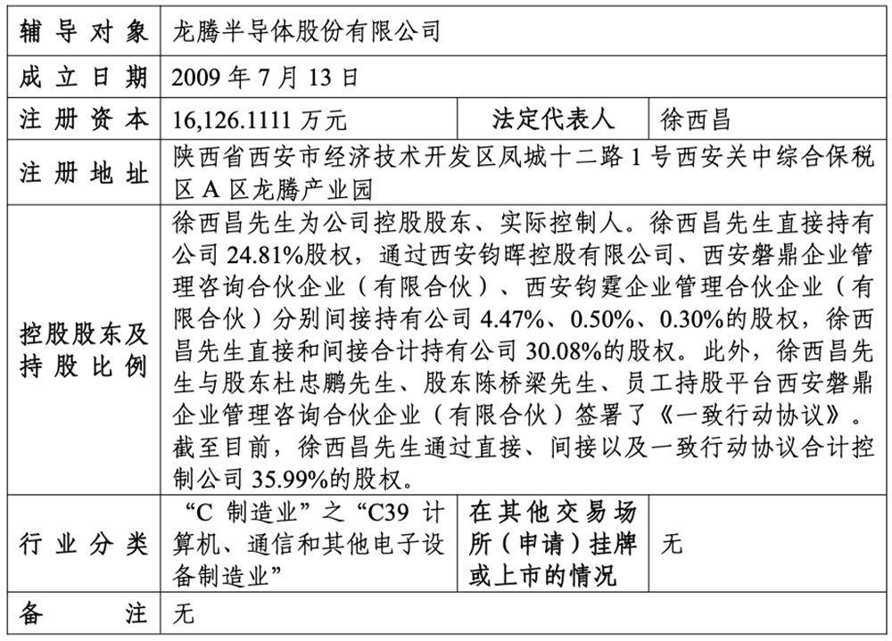 龙腾半导体成立于2009年7月,注册资本为1.61亿元,法定代表人、控股股东、实际控制人是创始人、董事长徐西昌。