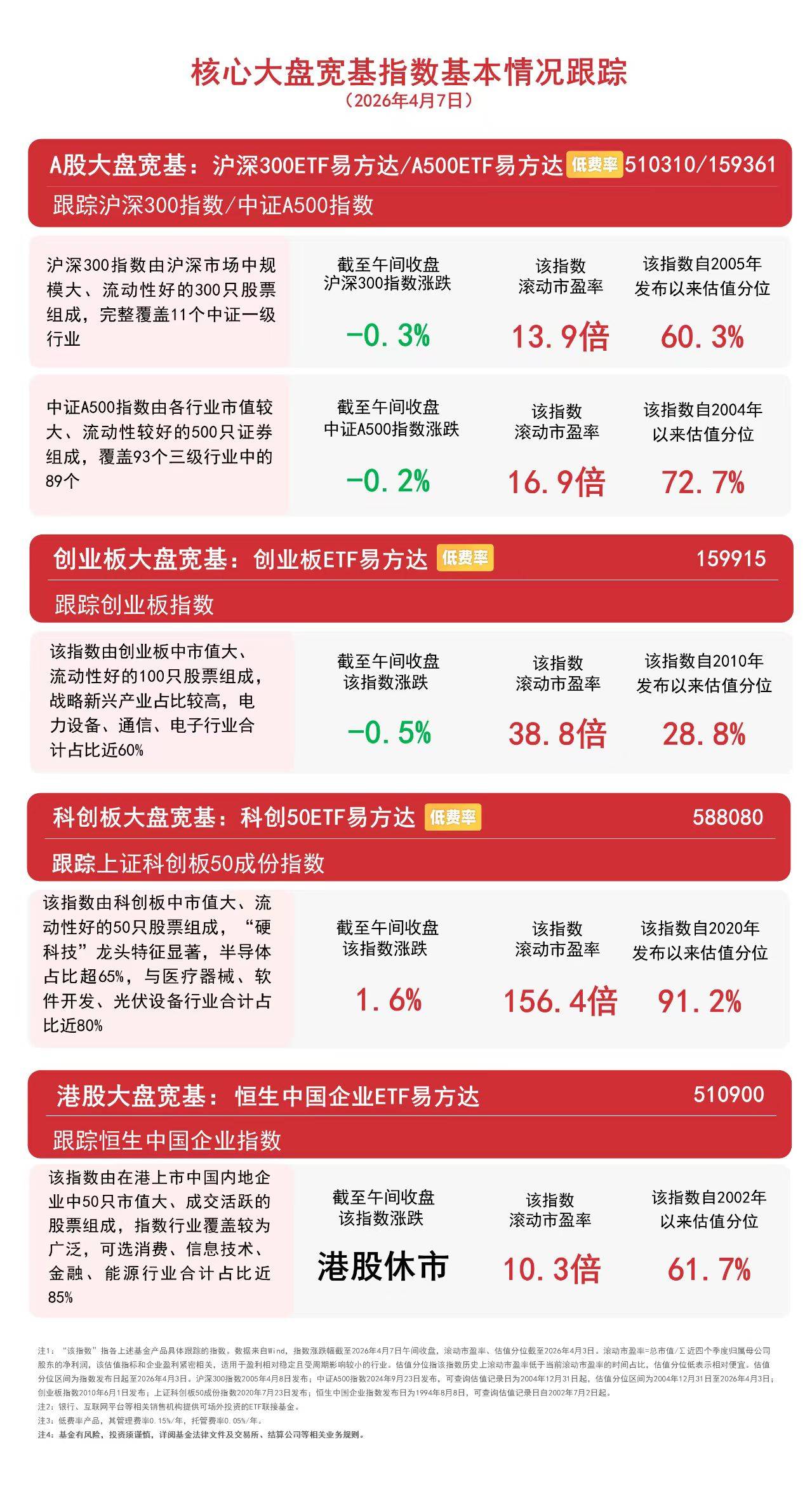 截至午间收盘,中证A500指数下跌0.2%,沪深300指数下跌0.3%,创业板指数下跌0.5%,上证科创板50成份指数上涨1.6%。相关ETF中,A500ETF易方达(159361,联接基金A/C/Y:022459/022460/022930)半日成交额超15亿元,获近7000万份净申购。